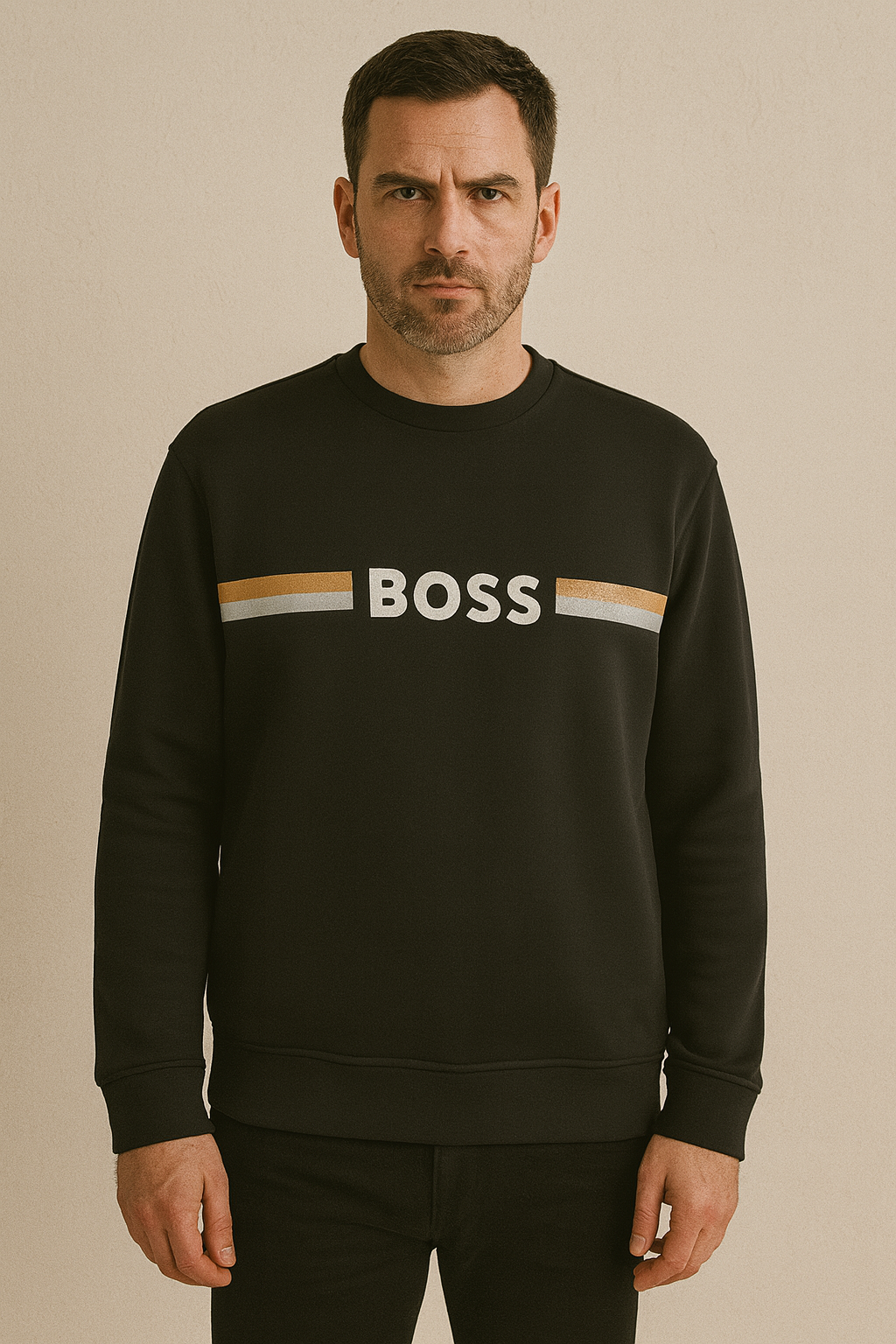 Црна блуза со хоризонтални контрастни линии и брендиран принт. Стилски, модерен модел погоден за секојдневно носење, кој нуди удобност и елегантна едноставност.