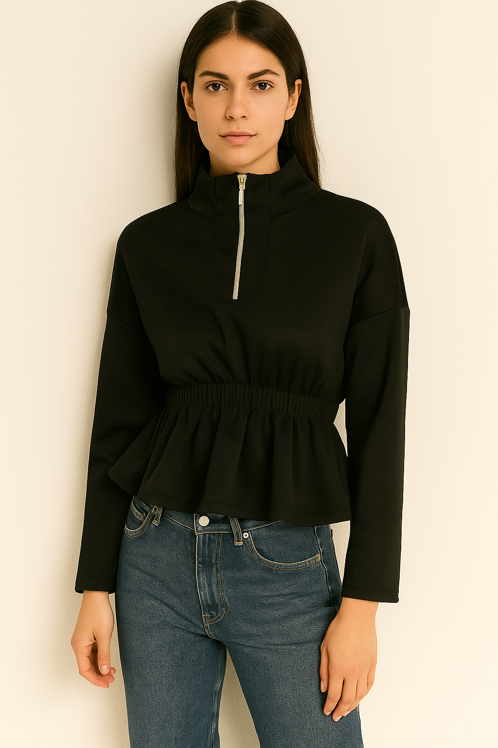 Црна блуза со патент и еластичен струк.